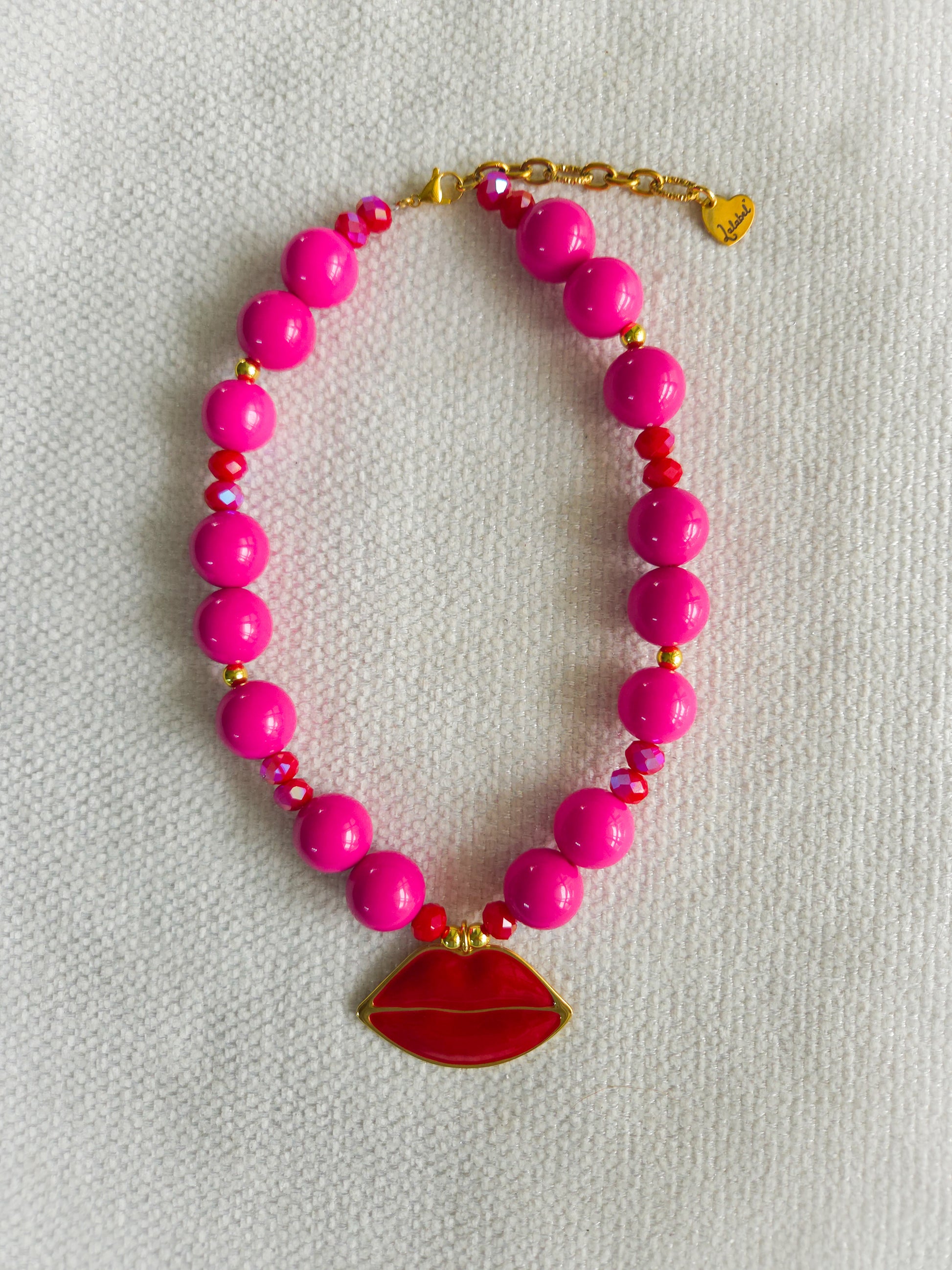 Candy Lips is a statement necklace designed to turn softness into strength. Glossy pink acrylic beads create a playful rhythm, balanced with polished hematite accents and gorgeous red iridescent crytal beads for depth and shine.